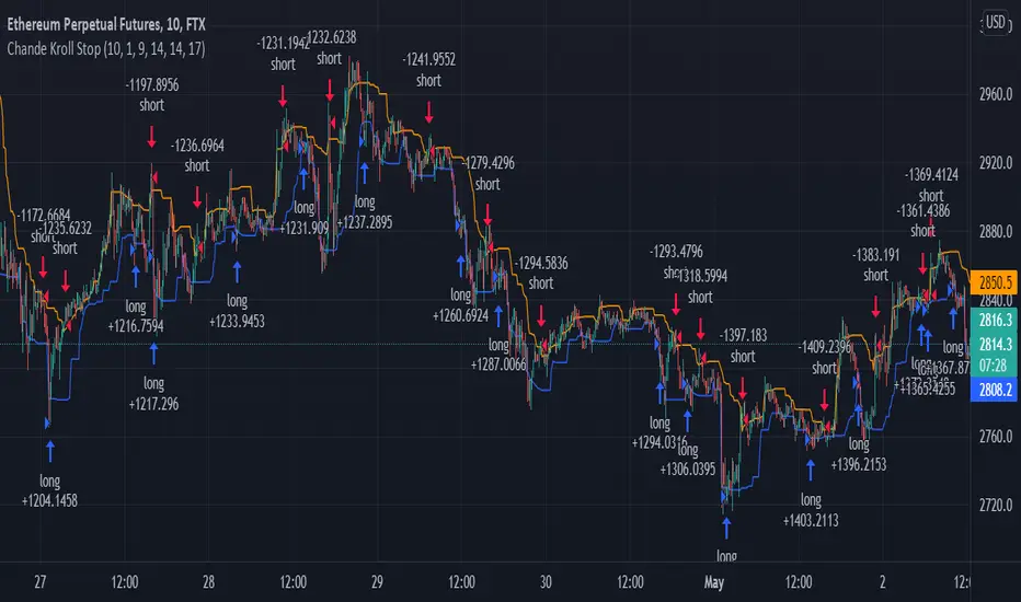 Hereby a script where i created a simple strategy using the underappreciated chande kroll stop indicator. Short signal is when the close crosses under the orange line and a long signal is generated upon a crossover of a close candle of the blue line.