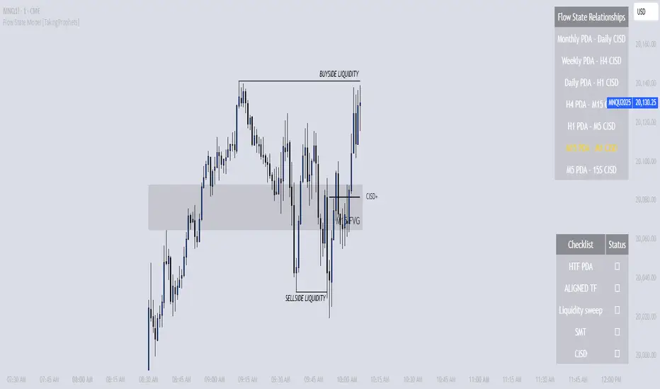 The "Flow State Model" by Taking Prophets is a precision-built trading framework based on the Inner Circle Trader (ICT) methodology. This script implements and automates the Flow State Model, a highly effective multi-timeframe trading system created and popularized by ITS Johnny.
