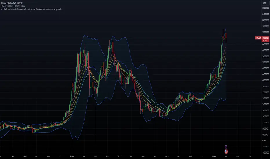 In summary, this script allows visualization of EMAs to identify short, medium, and long-term trends, along with Bollinger Bands to assess price volatility and overbought or oversold levels. This combination can assist traders in making informed trading decisions by identifying potential entry and exit points in the market.