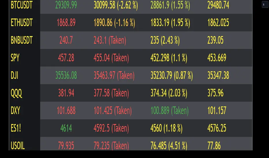 - Comprehensive Information: The indicator displays essential data in a clear and organized manner. The left column shows the ticker symbol, followed by the current price, Monday's high, Monday's low, and Monday's average in the subsequent columns.