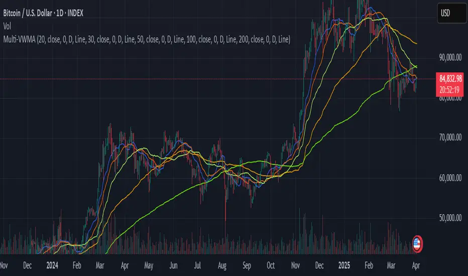 This indicator is useful for traders who want to analyze trends using multiple volume-weighted perspectives simultaneously. By comparing VWMAs of different lengths or based on different timeframes, you can gain insights into short-term vs. long-term trends, potential support/resistance levels, and the significance of price movements based on accompanying volume.