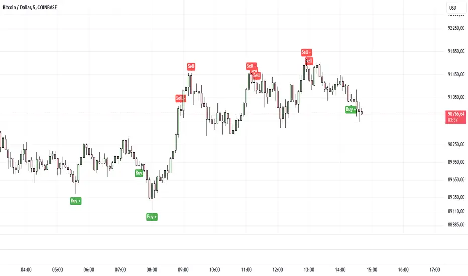 The indicator marks buy signals with a green “BUY” label below the bar, and sell signals with a red “SELL” label above the bar, directly on the chart for immediate clarity.