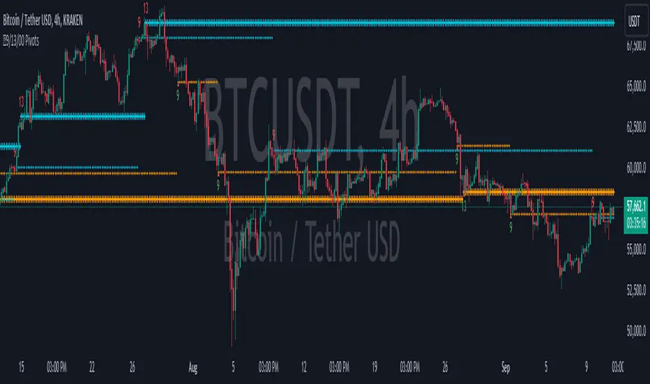 When this condition is true for 9 or 13 consecutive closes in a row, the indicator will mark the candle with the current number count as well as drawing a horizontal pivot to indicate the importance of the price level.