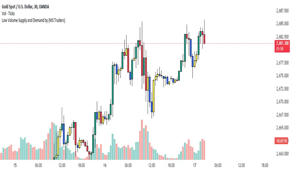 "Low Volume Supply and Demand" is a custom TradingView indicator designed to help traders identify potential supply and demand zones based on low-volume candle patterns. This indicator highlights bullish and bearish candles with lower volume compared to the previous two candles, making them significant in identifying possible market reversals or continuation points.