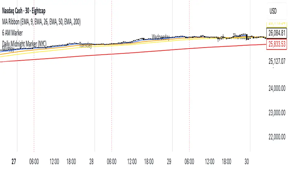 This indicator automatically plots a vertical line at midnight (00:00) New York time on every trading day.