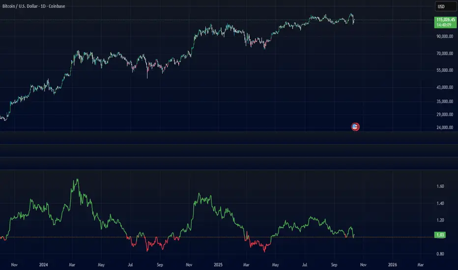 It emphasizes price momentum, revealing whether the price is extended above or below its historical average. A value above 1 implies the current price is higher than the 155-day average, and below 1 suggests the opposite.