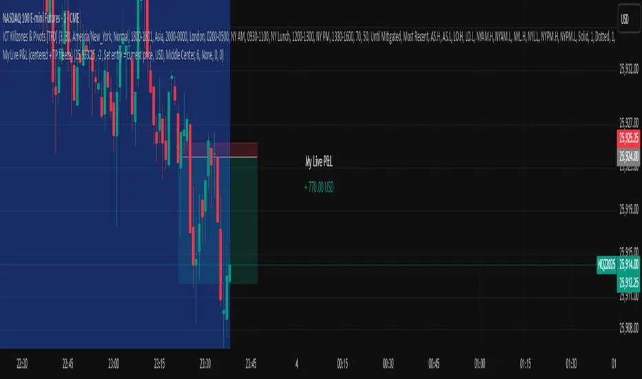 This script gives you a simple, no-nonsense way to see your live profit and loss right on your chart. It stays fixed in the center (slightly offset for balance), updating automatically as price moves — so you always know where you stand without checking your account tab.