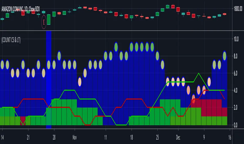 This indicator takes a ten day cumulative look at the Closing Scores, close to the low shown in red. The Closing Score's close to the high, show in green and finally the ten day count of the occurrence of long tails. Since this is calculated over a 10 day period of time, the scale is between 0 and 10.