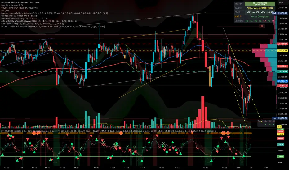 This indicator is a "Head-Up Display" designed specifically for trading NQ (Nasdaq-100 Futures). It aggregates data from the broader market (volatility) and the specific stocks that drive the Nasdaq index (The "Magnificent 7") to give you a single Trend Power Score.