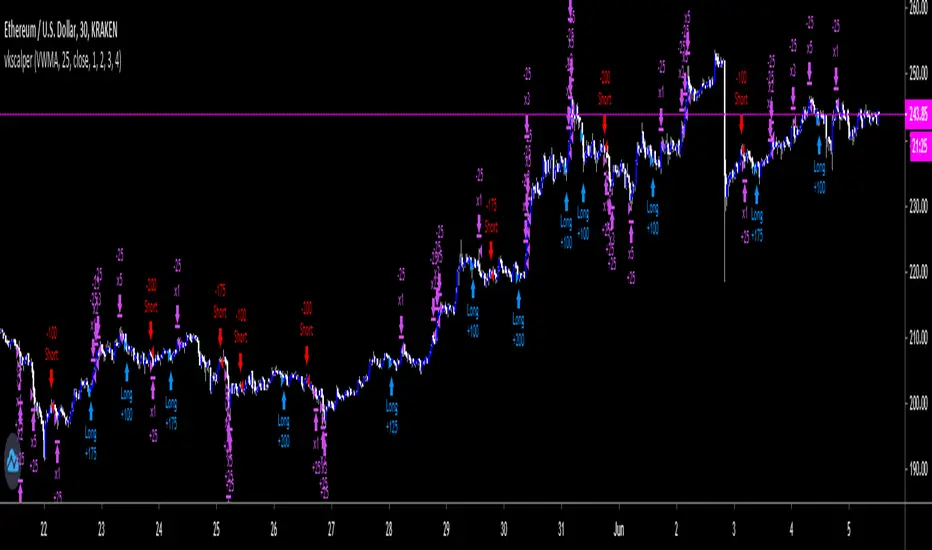 In this strategy, I actually implemented my own scalping style into building the strategy. Having to replicate my own trading strategy into an algorithm, I can't make it exactly perfect to how I would trade, but what I can do is try and program the parameters that give it the absolute best chance of making a big move with a small drawdown- which replicates part of my trend trading style. Here I am using VWMA , EMA and trend filtering values to find trend change and best entries.