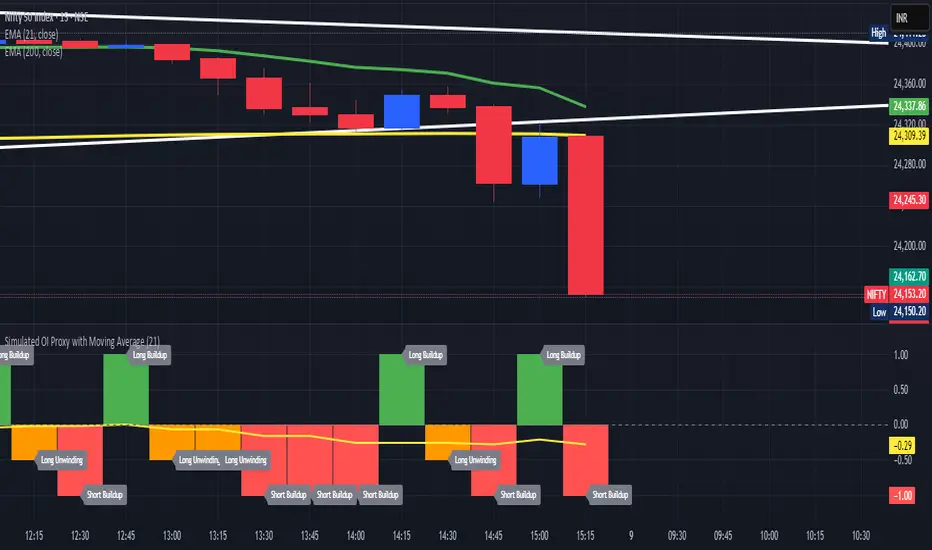 This custom TradingView indicator estimates market participation and positioning by simulating Open Interest (OI) using a proxy derived from price change and volume movement — useful especially when OI data is unavailable (e.g., NSE stocks or options).