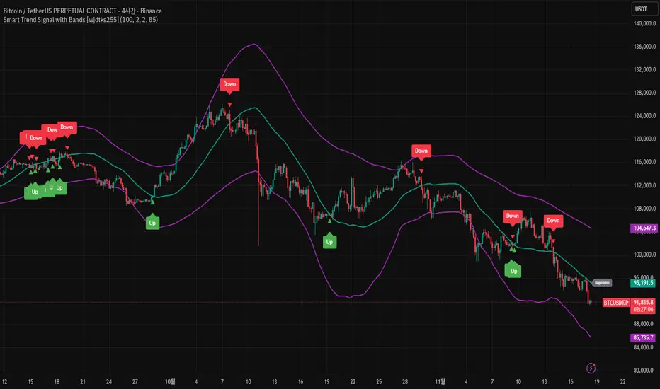 The "Adaptive Trend Kernel [wjdtks255]" is a versatile trend-following and volatility indicator designed to help traders identify dynamic market trends, potential reversals, and price extremes within a channel. Built upon a customized linear regression model, this indicator provides clear visual cues to enhance your trading decisions.