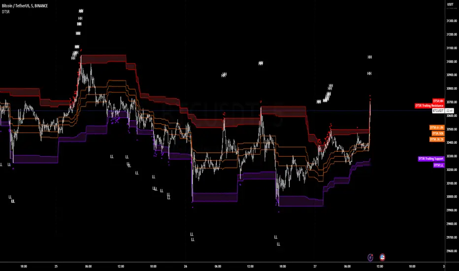 DTSR is an objective dynamic support and resistance zone channel, Unlike subjective technical analysis DTSR finds S&R zones by calculating a range threshold within a given range over a specified lookback. FIB (Fibonacci) 38.2% and 61.8% retracement zones are also plotted for intermediate zones of resistance / support within the main resistance / support zones.