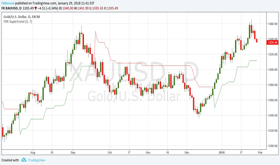 It also plots upper and lower bands above and below the price mid-point that are the underlying ATR bands on which the SuperTrend is based.