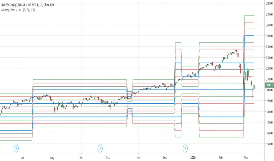 Added a Resolution input so you can now plot the Murrey lines from a higher timeframe. So, for example, you could plot the Weekly Murrey lines in a Daily chart. You should always select a resolution that is >= the chart resolution.Note di rilascio