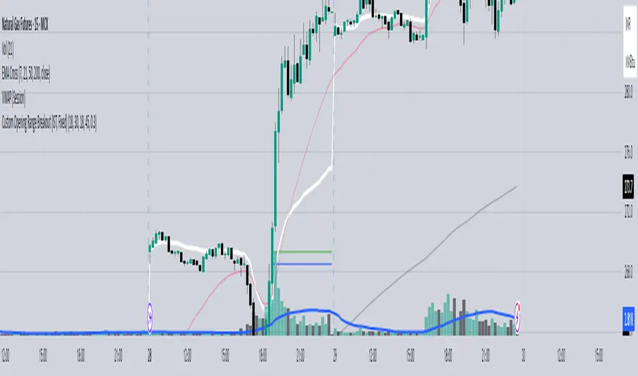The Custom Opening Range Indicator for Commodities is designed for instruments that trade nearly 24 hours, such as crude oil or natural gas. It allows traders to define the Opening Range based on Indian Standard Time (IST)—typically starting at 3:30 AM IST, which aligns with the global commodities market open. Users can customize both the start time and duration of the range (e.g., 5, 15, or 30 minutes). The indicator dynamically plots the high and low of this range and shades the area between them, providing a clear visual reference for breakout or reversal setups during the rest of the trading session.