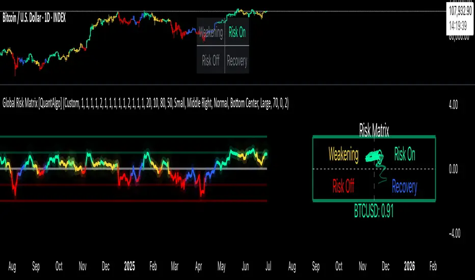 The indicator displays both a risk oscillator showing weighted average sentiment and a dynamic 2D matrix visualization that plots signal strength against momentum to reveal current market phase and historical evolution. This helps traders and investors understand broad market conditions, identify regime transitions, and align their strategies with prevailing macro risk environments across all asset classes.