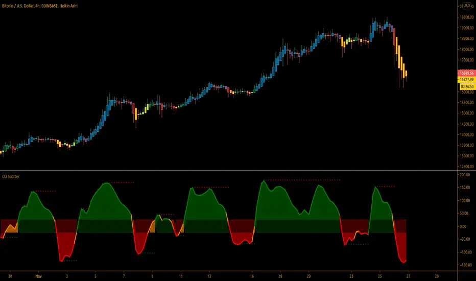 ™TradeChartist Simple CCI Spotter is an elegant version of the classic CCI indicator and helps spot price trends using visually engaging and appealing CCI plot and background. The Bull and the Bear background fills are highly useful for traders who like to visually understand areas of entry and exit based on CCI .