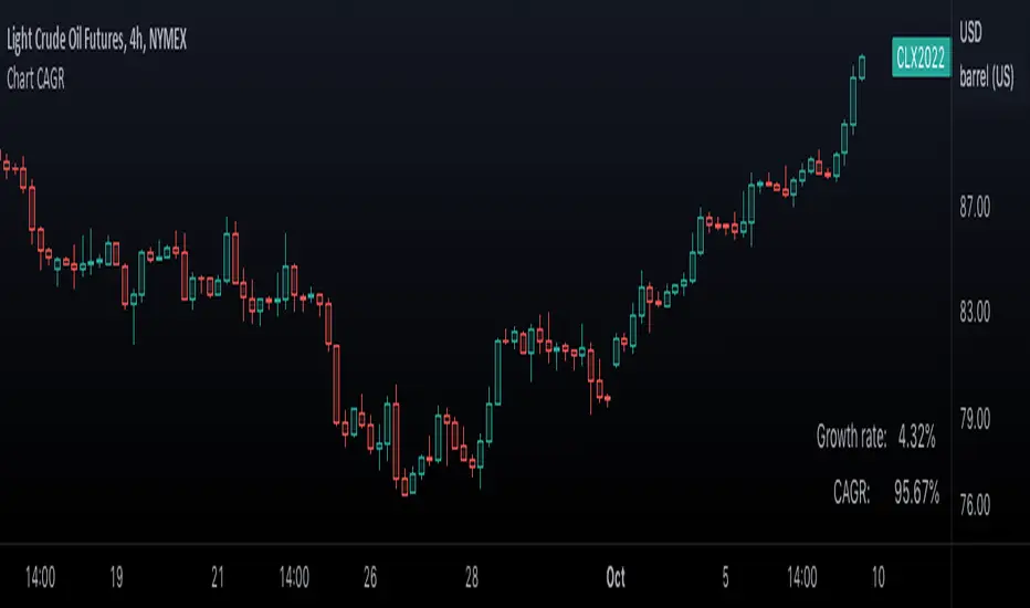 This simple script displays in the lower-right corner of the chart the Growth Rate and the Compound Annual Growth Rate (CAGR) between the open of the chart's first visible bar and the close of its last bar. As you zoom/scroll the chart, calculations will adjust to the chart's bars. You can change the location and colors of the displayed text in the script's settings.
