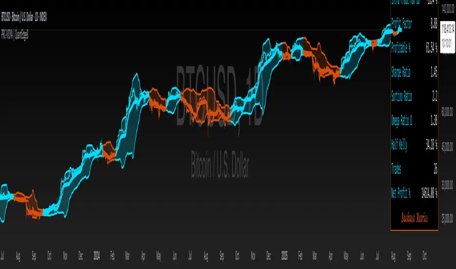The PRC-VIDYA(Volatility–Indexed Dynamic Average) is a sophisticated trading indicator developed for traders looking to capitalize on trend shifts with enhanced filtering mechanisms. It blends an Endpoint VIDYA filter—an adaptive, volatility-scaled moving average with percentile-based thresholds and a median-absolute-deviation buffer to craft a dynamic entry/exit envelope. Price thrusts beyond the upper or lower band generate crisp long/short signals, complete with colored fills, candle tinting, alerts and optional backtest stats