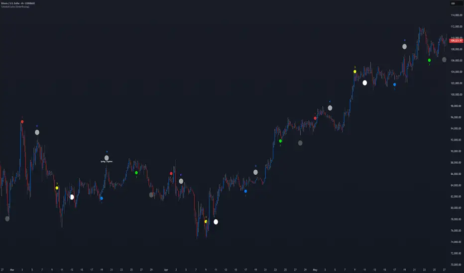 The Celestial Cycles indicator is a simple yet complex script that merges the timeless influence of astronomical events with modern technical analysis. By plotting key celestial phenomena, such as moon phases, seasonal markers, and Mercury retrograde periods onto your price chart, this indicator offers traders a fresh perspective on market cycles.