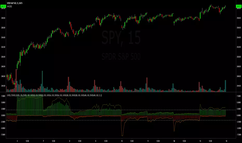 DVOL is represented as negative - UVOL as positive. When either is above 2 its a good predictor of the day's outcome. At least - it tells you if the bulls or bears are winning the day.