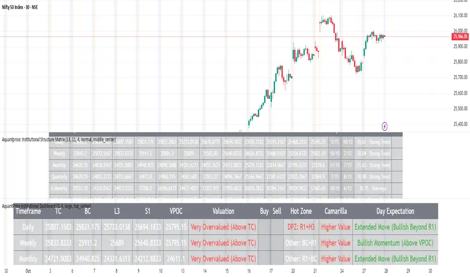 Multi-Timeframe Trend Validators (1min to Monthly): 15 buy / 13 sell conditions using CPR pivots, weighted closes, and Camarilla logic — signals "BUY"/"SELL" only when threshold met.