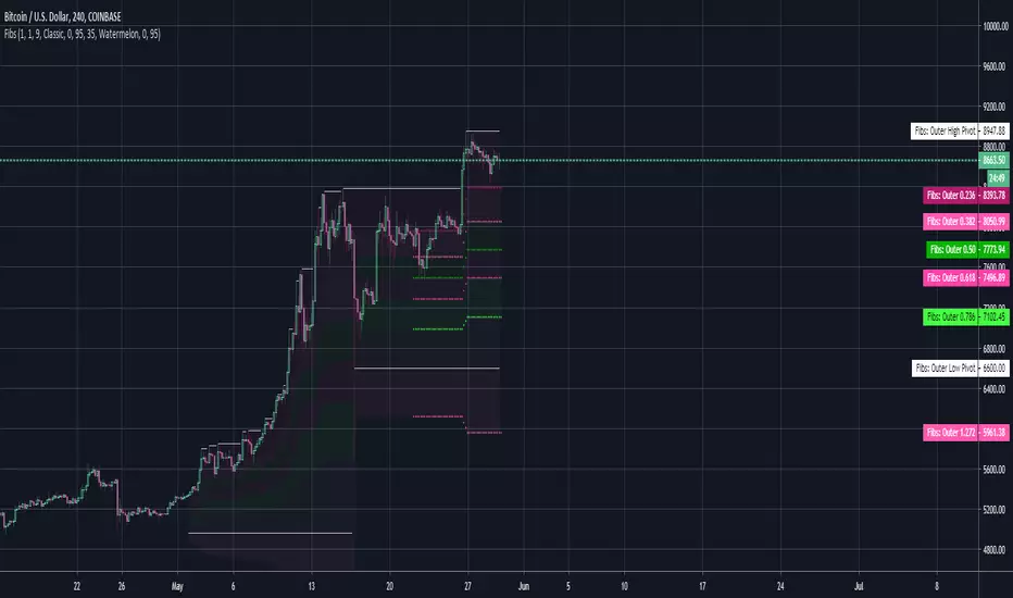 You can have two sets of Fibs, Inner and Outer. Use the outer for the larger runs and the inner for smaller. The Fib lines have a look back view window of 48 bars and the base/resistance lines have 168 (a week's worth of time on the 1h). The lookback window is based on the view (show_last param) not the pivot calculations.