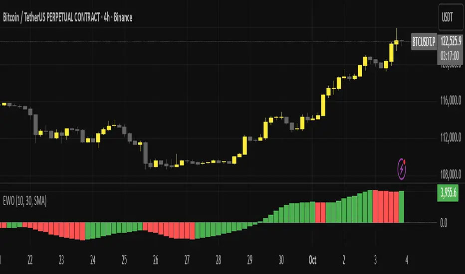 If price is the story, impulse is the emotion behind each chapter. The Elliott Wave Oscillator (EWO) is a clean way to see that emotion: it’s just the difference between a fast and a slow moving average. When the fast MA pulls away from the slow MA, the histogram grows; when they come back together, it shrinks. Above zero = bullish impulse; below zero = bearish impulse.