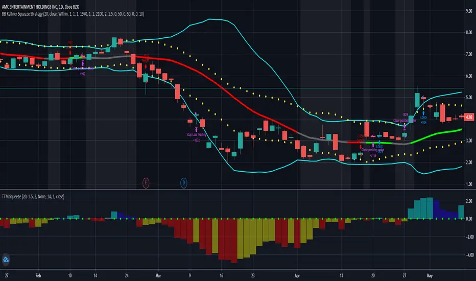 Shows all bollinger bands (solid lines) and keltner channels (dotted line) and will go long/short when a squeeze happens between bollinger bands and keltner channel and exit the positions once there is no more momentum