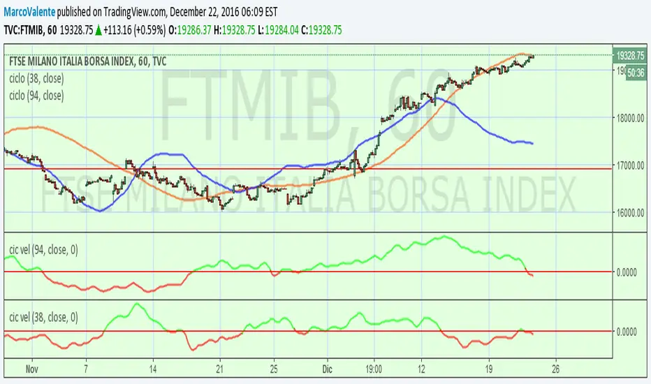 Cycle analisys made by MA builted usisng the difference between 2 MA , one with lenght double then the other one. Cycle speed indicator is the moment of the Cycle MA and give us the up or down of the Cycle MA