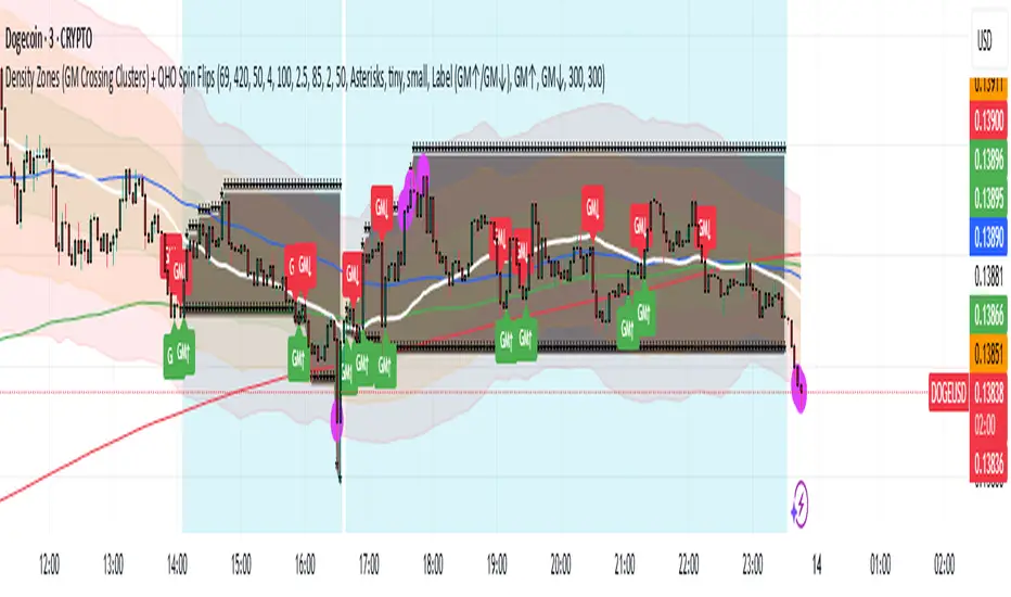 A “Density Zone” is detected when price repeatedly crosses a Geometric Mean equilibrium line (GM) within a rolling lookback window. Conceptually, this identifies regions where the market is repeatedly “snapping” across an equilibrium boundary—high churn, high decision pressure, and repeated re-selection of direction.