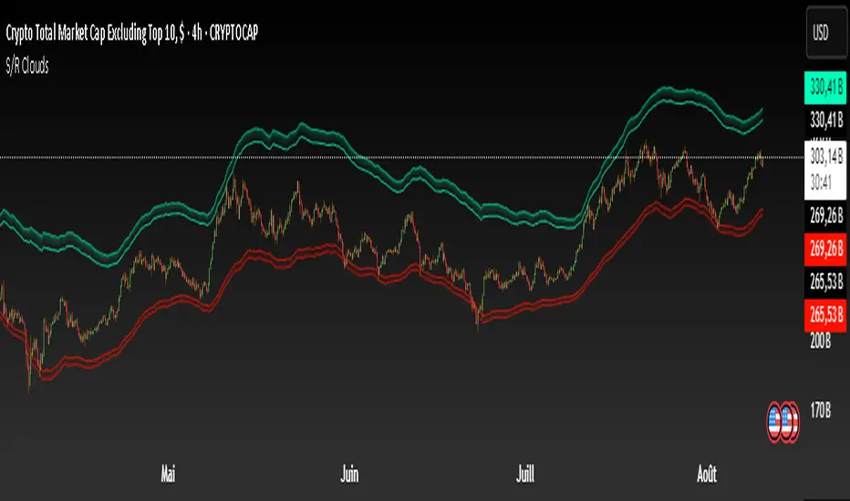 The S/R Clouds Indicator is a sophisticated TradingView tool designed to visualize support and resistance levels through dynamic cloud formations. Built on the principles of Keltner Channels, it employs a central moving average enveloped by volatility-based bands to highlight potential price reversal zones. This indicator enhances chart analysis with customizable aesthetics and practical alerts, making it suitable for traders across various strategies and timeframes.