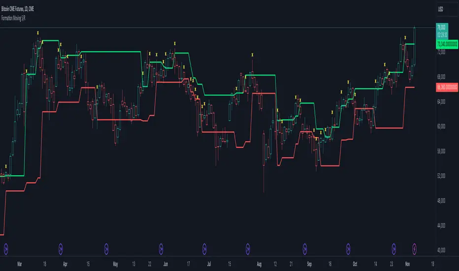 The Formation Defined Moving Support and Resistance indicator is a sophisticated tool for identifying dynamic support and resistance levels based on specific price formations and level interactions. This indicator goes beyond traditional static support and resistance by updating levels based on predefined formation patterns and market behaviour, providing traders with a more responsive view of potential support and resistance zones.