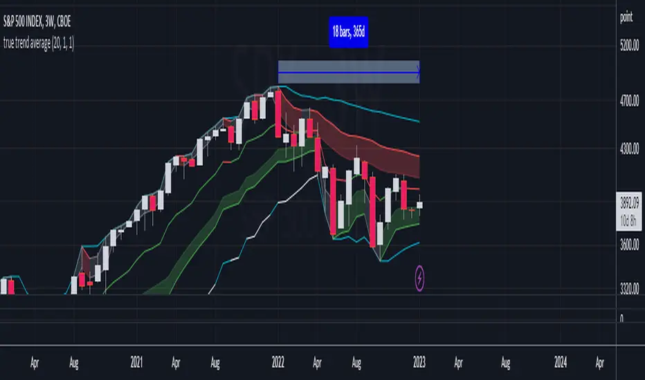 - The upper green band line shows the true trend average hl2 price since the last significant low within 20 bars.