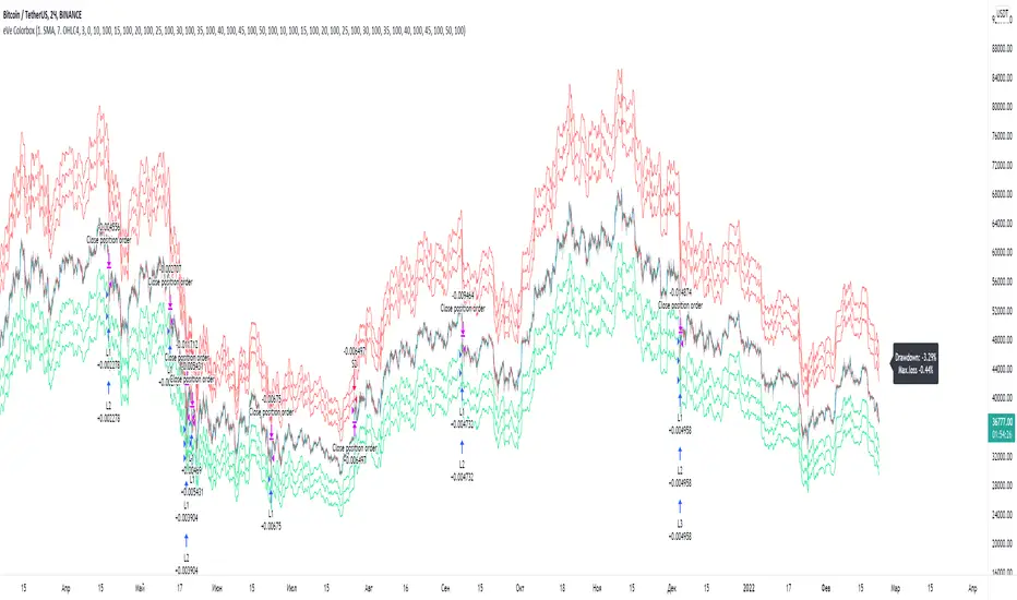 Red lines - a shifted moving average for opening a short position using a limit order.