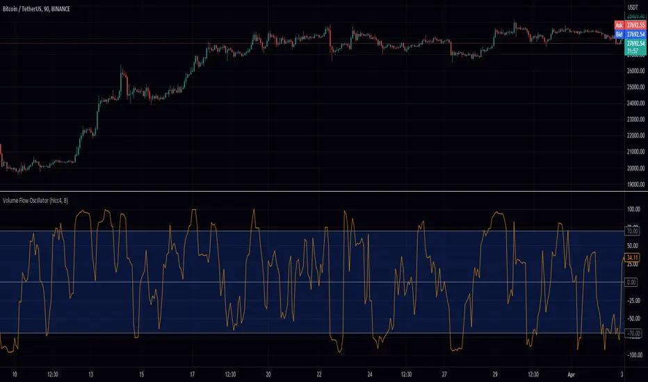 Introducing the "Volume Flow Oscillator" indicator, a powerful and adaptable tool that incorporates the PeacefulIndicators library to analyze price movement strength and volume in the market. This indicator is designed to assist you in detecting potential opportunities and improving your trading analysis.