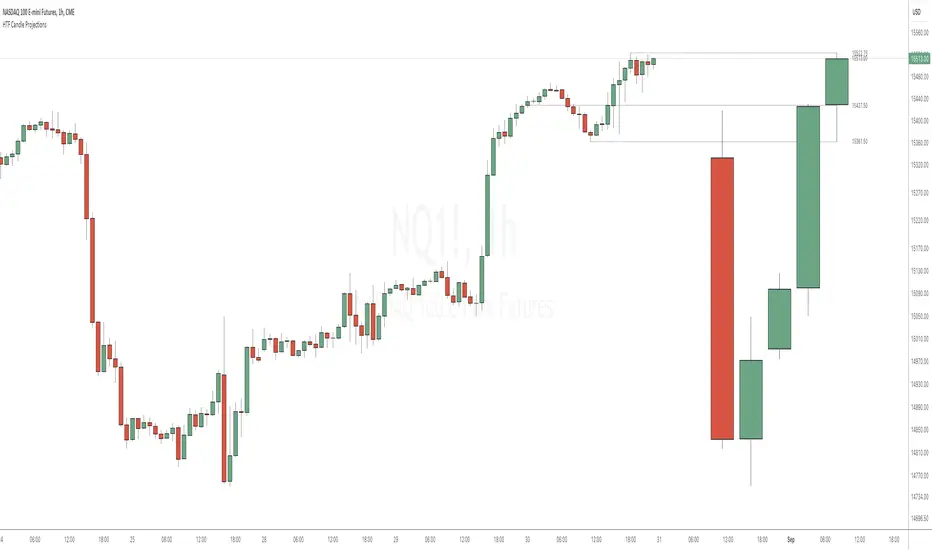 This indicator is highly inspired by the HTF Power of Three indicator by toodegrees but is fully free and open source, it also have support for showing more than just one candle in the projection. It is also inspired by the HTF Candle Insights (Expo) indicator by Zeiierman but differ in the way that it update the HTF candles in real time and also have support for showing Open/High/Low projections that also updates in real time.