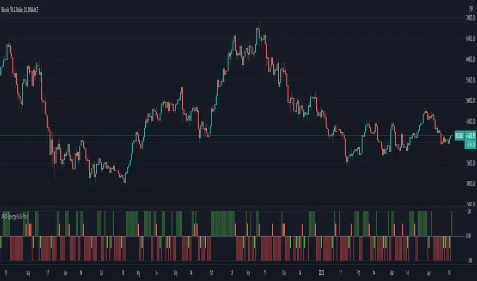 Closing price in front of the middle point of the body of Heikin Ashi. So we can get more trend information from the Heikin Ashi chart. The basic idea behind combined charts is to be ready to act when a warning (0.5 or -0.5) is displayed during a trend.