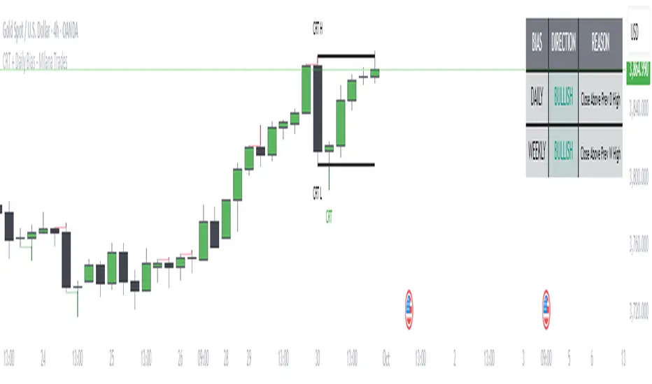 This indicator merges Candle Range Theory (CRT) with a Daily & Weekly Bias model, offering traders a complete view of both short-term price traps and higher-timeframe market direction. It is designed to highlight potential liquidity traps, reversals, and directional bias in a structured and visually intuitive format.