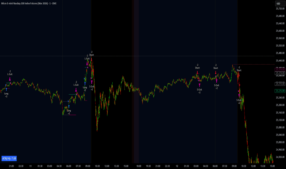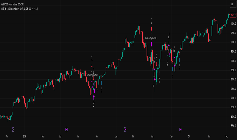 Nasdaq Liquidity Fade Engine (NLFE)Summary in one paragraph Nasdaq Liquidity Fade Engine is a daily timeframe strategy for Nasdaq index futures and close proxies such as NQ, MNQ, and NDX. It is designed to act only when a small set of tape, mean location, and trend energy conditions align, and it expresses risk using an ATR sized bracket so the same settings scale across NQ and MNQ. It is original because it can optionally anchor its signal feed to a single continuous Nasdaq tape while executing on related instruments, reducing symbol noise when you want one consistent decision stream. Add it to a clean chart and read entries and exits from the built in strategy markers. Orders confirm on bar close, so markers settle on close. Scope and intent • Markets. NQ, MNQ, NDX, and other highly liquid Nasdaq linked instruments • Timeframes. Primarily daily, other timeframes are supported but not the optimization target • Default demo used in the publication. CME_MINI:NQ1! on 1D • Purpose. Provide a compact, auditable daily decision engine for Nasdaq instruments with explicit volatility scaled risk • Limits. This is a strategy. Orders are simulated by the TradingView engine on standard candles only Originality and usefulness This is not a stack of common indicators. It is a minimal asymmetric rule set with a portability layer. • Unique concept or fusion. Optional tape anchored signal feed plus asymmetric long and short gating plus ATR normalized risk brackets • What failure mode it addresses. Reduces discretionary over trading by restricting entries to specific tape states and by enforcing a hard stop framework instead of indefinite holds • Portable yardstick. ATR on the traded symbol is the common unit for stop and target sizing across NQ and MNQ • Protected scripts. The implementation is protected to reduce low effort cloning and to preserve version integrity, while the method and practical use are disclosed here Method overview in plain language The strategy evaluates a small set of state conditions on each bar. It uses a selected signal feed for its tape inputs and applies risk on the traded chart symbol. Long and short are intentionally asymmetric to reflect Nasdaq drift and downside behavior. Base measures • Tape state. Candle direction and relative participation measured from the selected signal feed • Mean location. A rolling mean reference used to define location and fade context • Trend energy. A trend strength filter used to avoid low quality fades • Risk unit. ATR of the traded symbol used as a volatility scaled sizing unit for exits Components • Tape contraction state. Detects low participation pullback behavior on the signal feed. Used to qualify long opportunity context in a way that is not tied to a fixed point value. • Mean location state. Uses a rolling mean reference to avoid taking fades in the wrong location regime. • Trend energy gate. Uses a trend strength threshold to require sufficient directional energy when the short side activates. • ATR bracket risk. Uses ATR multiples for stop and target distances on the traded symbol, keeping risk scalable across NQ and MNQ. Fusion rule The model uses two separate gate sets. Long and short do not share identical prerequisites. The intent is to capture pullback opportunity under contraction while only enabling shorts when location and energy align. Signal rule • Long suggestion appears when the tape state indicates a contraction style pullback and the regime filter is satisfied • Short suggestion appears when the tape state indicates a fadeable push that is location constrained under the mean reference and trend energy is above the threshold • Long only mode disables opening shorts, while still allowing the short condition to flatten an open long • Long and short mode allows directional flips when the opposite condition triggers Inputs with guidance Setup • Use NQ as signal source. When enabled, the tape inputs are sourced from the chosen NQ feed so signals can remain consistent across NQ, MNQ, and NDX charts. When disabled, tape inputs come from the chart symbol. • NQ symbol. The anchor feed used when signal sourcing is enabled. • Signal timeframe. Blank uses the chart timeframe. For the intended daily workflow, use 1D. Logic • EMA length. Typical range 10 to 60. Higher values smooth the mean reference and reduce sensitivity. Lower values increase responsiveness. • Start year filter. Use to constrain testing to the regime you want to study. Defaults reflect the post 2008 regime focus. Filters • ADX length and smoothing. Typical range 10 to 20. Shorter reacts faster and can increase churn. • ADX minimum. Typical range 15 to 30. Raising it filters shorts and concentrates on higher energy phases. Risk • Use ATR stop and target. Enables ATR sized bracket exits. • ATR length. Typical range 10 to 21 on daily. • Stop ATR multiple. Typical range 0.3 to 2.5. Raising it gives more room and increases risk per trade. • Target ATR multiple. Typical range 4 to 30 for more frequent targets. Very large values behave like an expansion capture mode where exits are dominated by the stop or by an opposite regime switch rather than by the target. Properties visible in this publication • Initial capital for the example. 100000 • Base currency. USD • request.security uses lookahead off everywhere • Strategy only. Default order size method Fixed with value 1 contract. Pyramiding 0. Commission 5 USD per contract. Slippage 5 ticks. Process orders on close On. Bar magnifier Off. Recalculate after order is filled Off. Calc on every tick Off. Realism and responsible publication • No performance claims. Past results never guarantee future outcomes • Execution varies by venue, liquidity, and volatility • Orders process on bar close and fills use TradingView engine assumptions • Non standard chart types are not supported for strategies Honest limitations and failure modes • This is opt