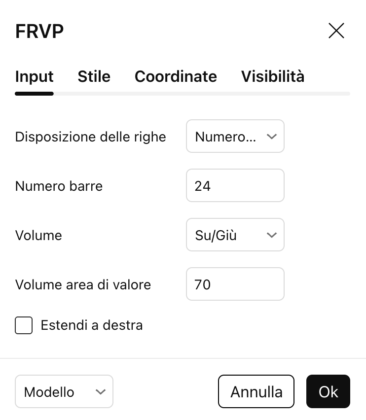 Consente di scegliere tra la visualizzazione del volume totale per ogni riga (Totale), la suddivisione di ogni riga in rialzista/ribassista (Up/Down) o la visualizzazione della loro differenza (Delta).