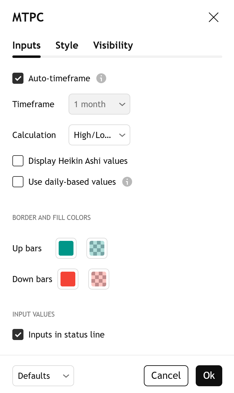 Nota: questo indicatore visualizza fino a ~500 riquadri che coprono le barre HTF più recenti. È possibile visualizzare le caselle delle barre precedenti utilizzando la modalità Bar Replay.Input