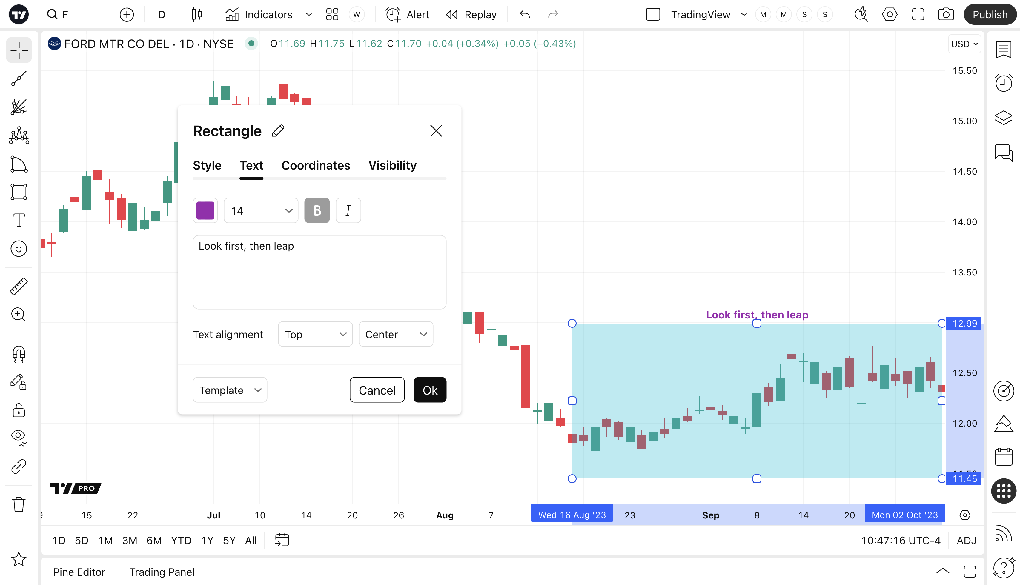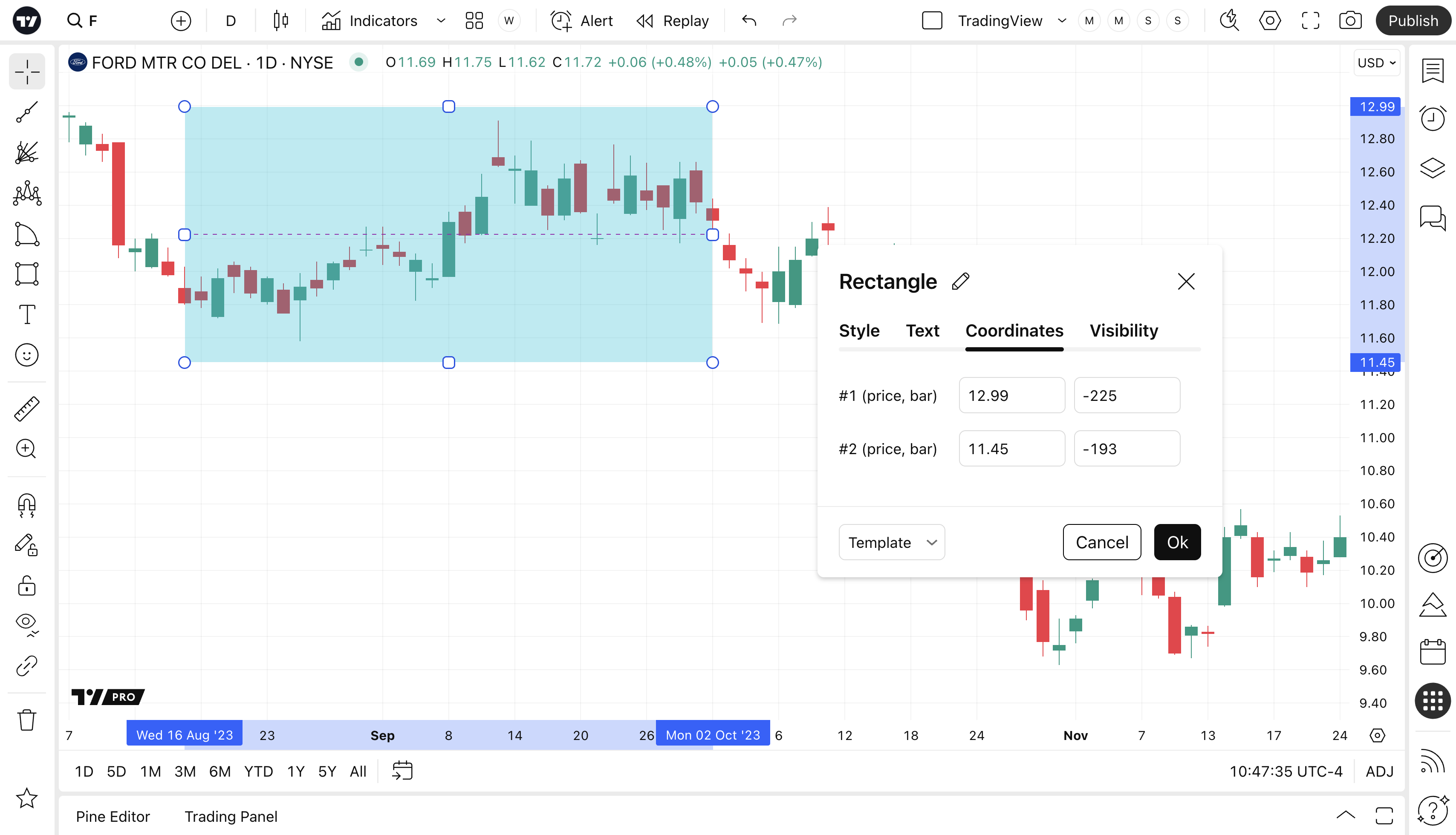 Nella finestra di dialogo delle proprietà delle Coordinate è possibile impostare con precisione la posizione dei punti del rettangolo sull'asse dei prezzi (impostando il prezzo) e sull'asse del tempo (impostando il numero di barre):