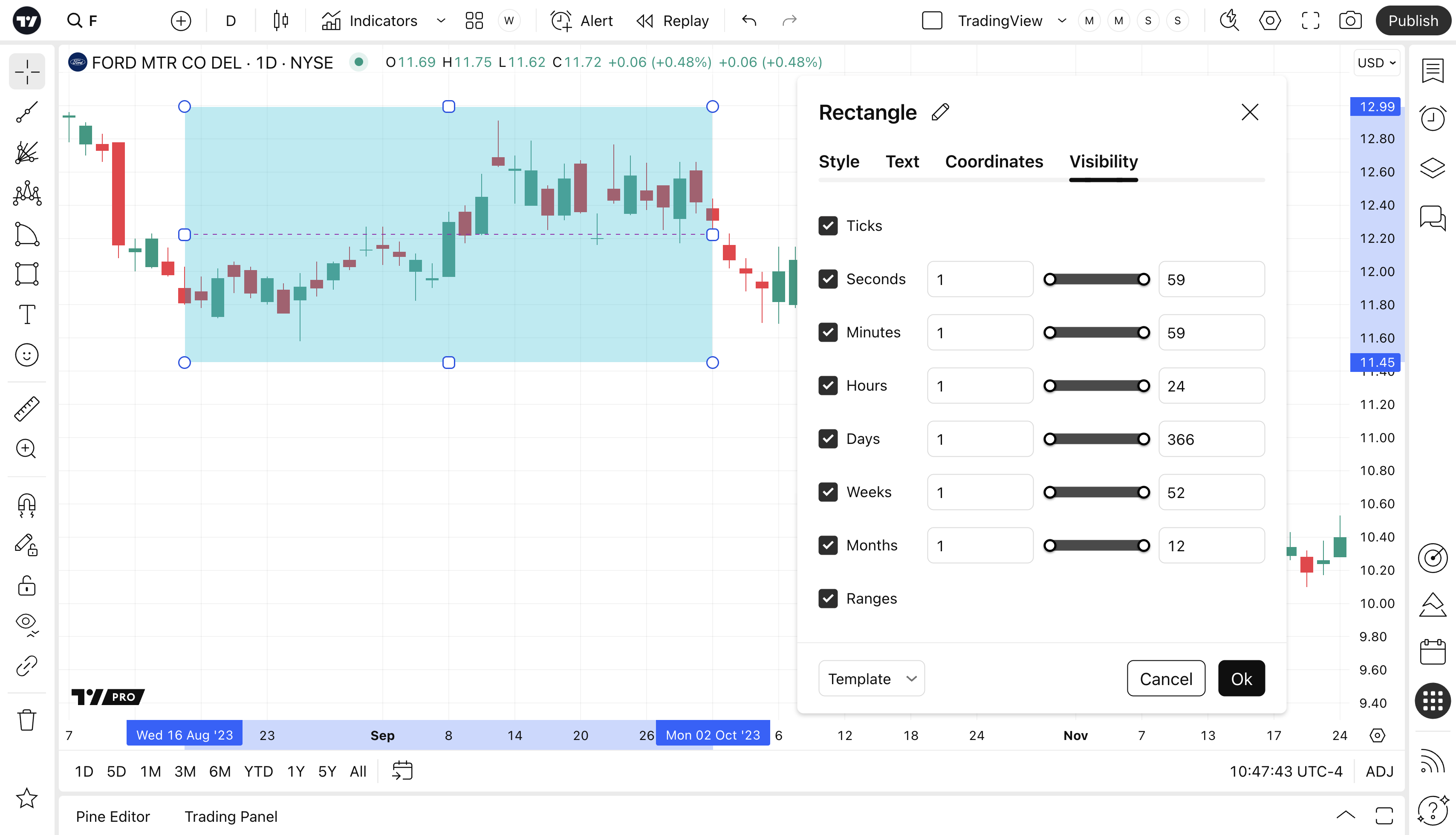 Nella finestra di dialogo della scheda di visibilità è possibile cambiare la visualizzazione dello strumento Rettangolo su grafici di diversi timeframe: