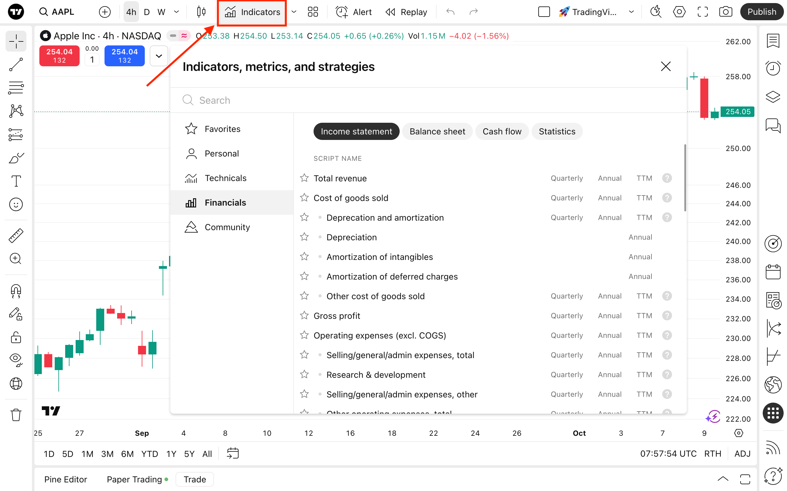 Nota: sui grafici, i dati finanziari potrebbero differire da quelli riportati nei bilanci societari.Nella barra degli strumenti superiore del grafico, fare clic sul pulsante Indicatori, metriche e strategie nel pannello superiore e selezionare la scheda Dati finanziari.
