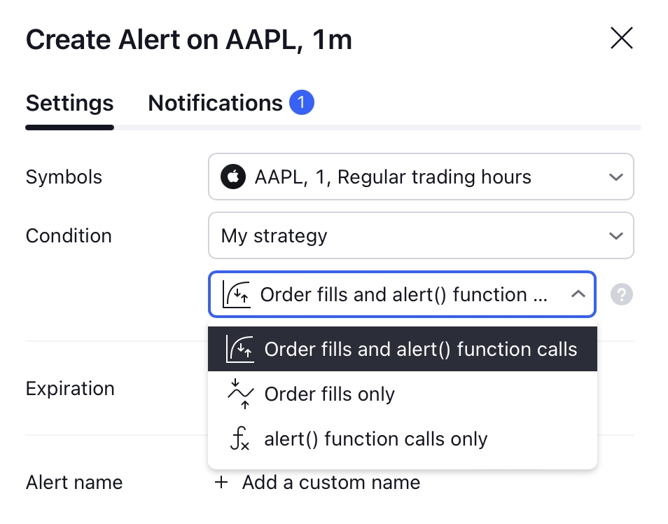 Gli alert su script e strategie possono includere eventi di esecuzione degli ordini, eventi di chiamata della funzione “alert()” o entrambi.