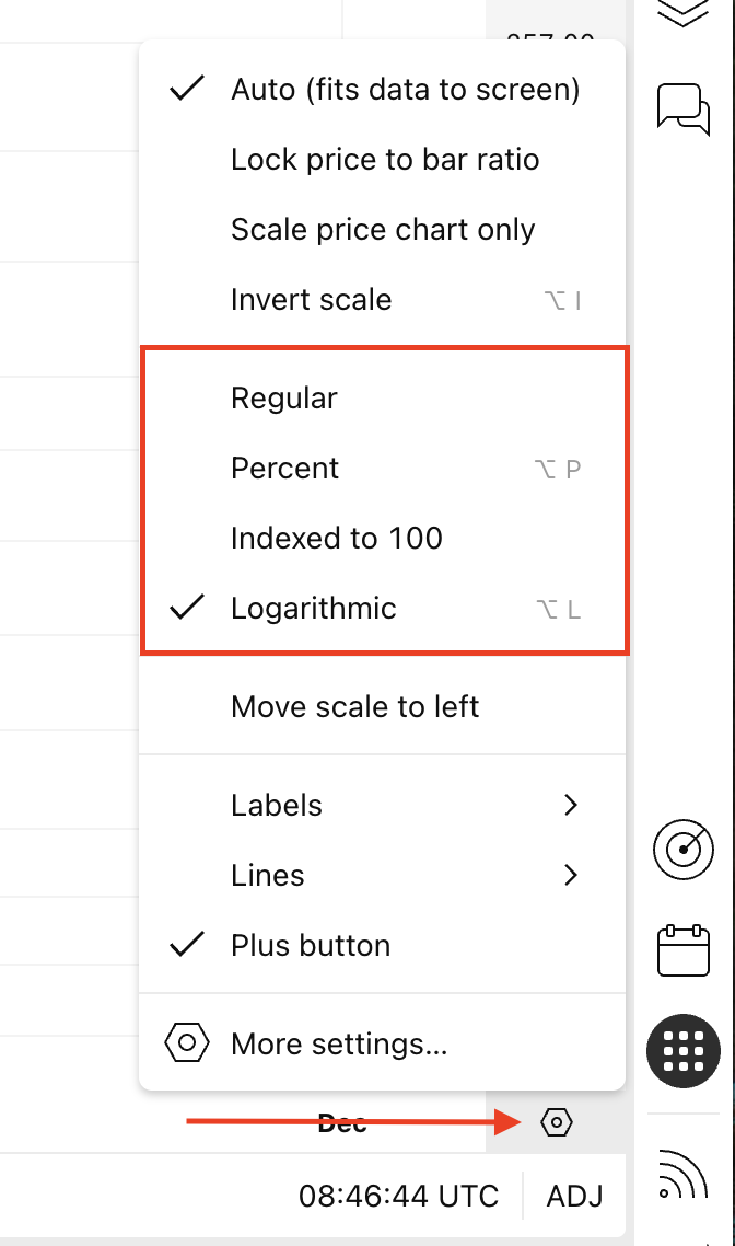 A causa dell'attuale implementazione della scala logaritmica e di alcuni fattori analisi tecnica, gli alert basati su questa scala potrebbero non riflettere con precisione l'esatta posizione di un disegno, causando comportamenti di attivazione inaspettati. Per evitare questo problema, si consiglia di passare dalla scala logaritmica alla scala lineare. In questo modo, gli alert si baseranno su calcoli più precisi, garantendo condizioni di attivazione più accurate.
