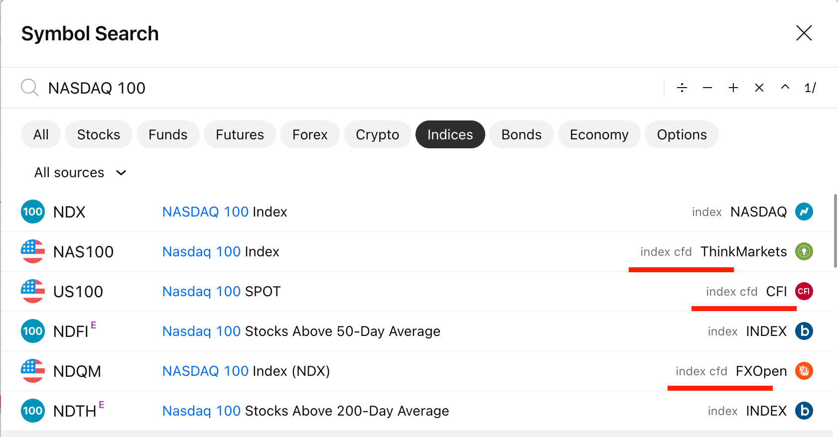 - Indici, poiché generalmente non sono negoziabili. Ad esempio NASDAQ:NDX