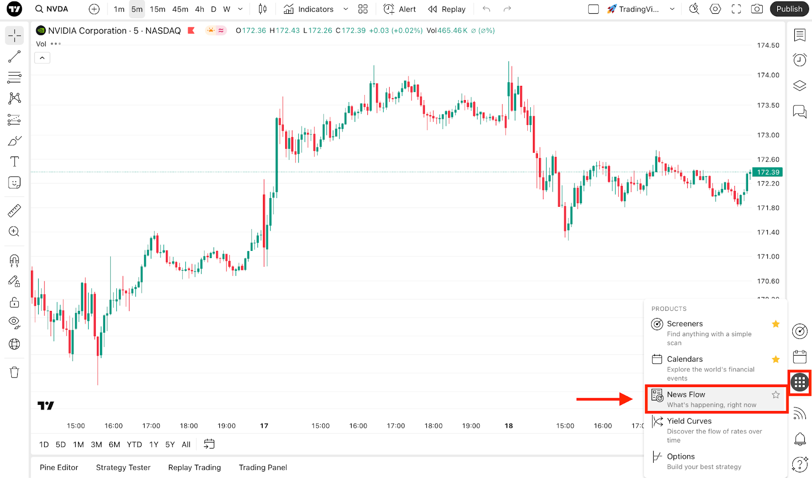 Dai grafici, trova il pulsante “Prodotti” sulla barra degli strumenti a destra e clicca su “Flusso di notizie”.